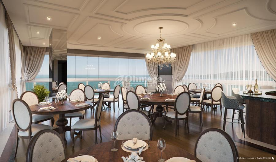 Enxoval do Salão de Festas com louças de porcelana filetadas a ouro e talheres de alta qualidade.